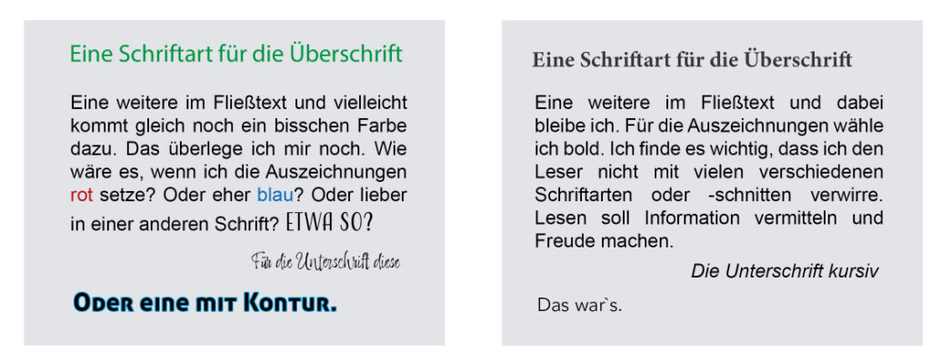 Das dritte Missverständnis ist schnell erklärt und erstaunlich beliebt: Gestaltung wird mit Menge verwechselt. Mehr Farben, mehr Schriften, mehr Effekte – das wirkt im ersten Moment beeindruckend. So ein bisschen wie ein Buffet, bei dem man sicherheitshalber alles auf den Teller lädt, falls etwas besonders gut sein könnte.